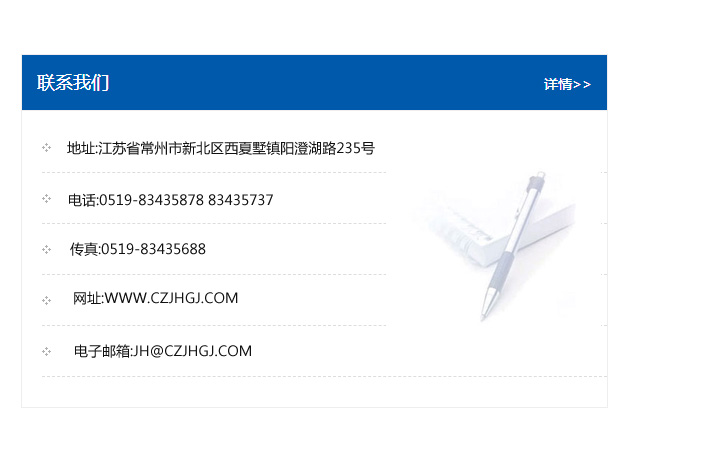 傳真:0519-83435688    郵編:213135    網址:WWW.czjhgj_com.yueliving.com    電子郵箱:JH@czjhgj_com.yueliving.com